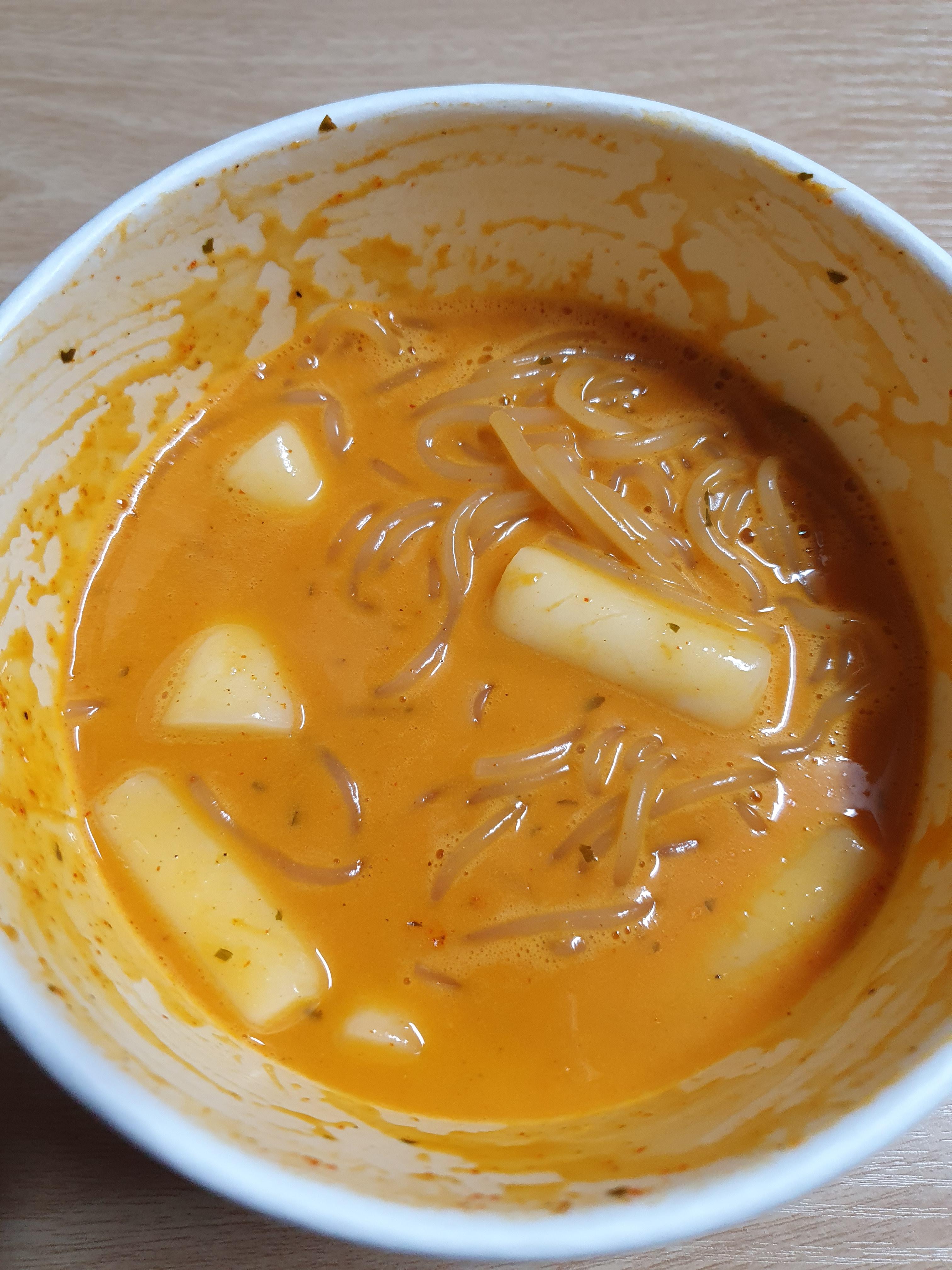 소스 맛이 좋습니다. 맛있는 로제 소스 맛입니다. 떡도 아주 쫄깃쫄깃합니다. 쫄깃쫄깃한 면발은 고무줄 식감이라 좀 퍽퍽했어요. 쫄면이 더 잘 나왔으면 아주 좋은 제품이 되었을 텐데.